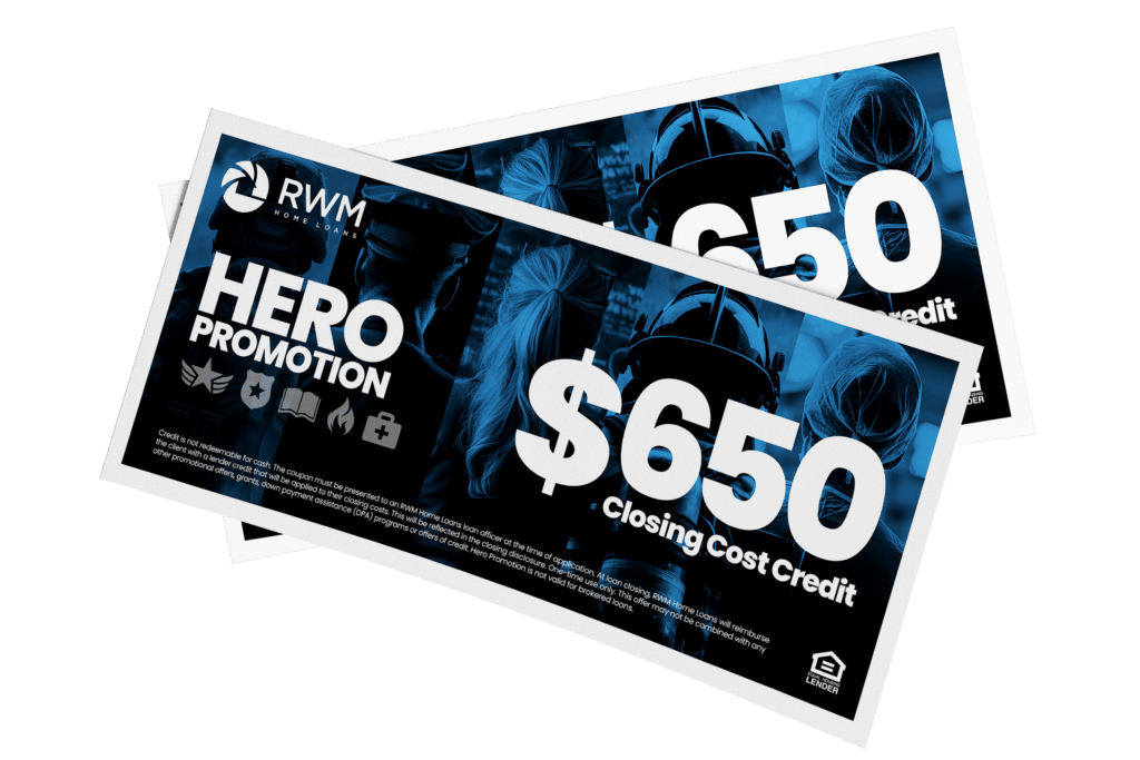 Credit is not redeemable for cash. The coupon must be presented to an RWM Home Loans loan officer at the time of application. At loan closing, RWM Home Loans will reimburse the client with a lender credit that will be applied to their closing costs. This will be reflected in the closing disclosure. One-time use only. This offer may not be combined with any other promotional offers, grants, down payment assistance (DPA) programs or offers of credit. Hero Promotion is not valid for brokered loans.